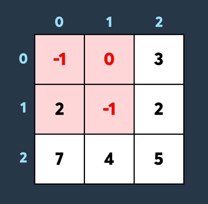 이렇게 하면 정확성 테스트는 통과하지만, 효율성 테스트에선 실패한다. 2차원 배열의 원소를 일일이 참조하기 때문에 시간복잡도가 O(M*N)이 되기 때문이다.